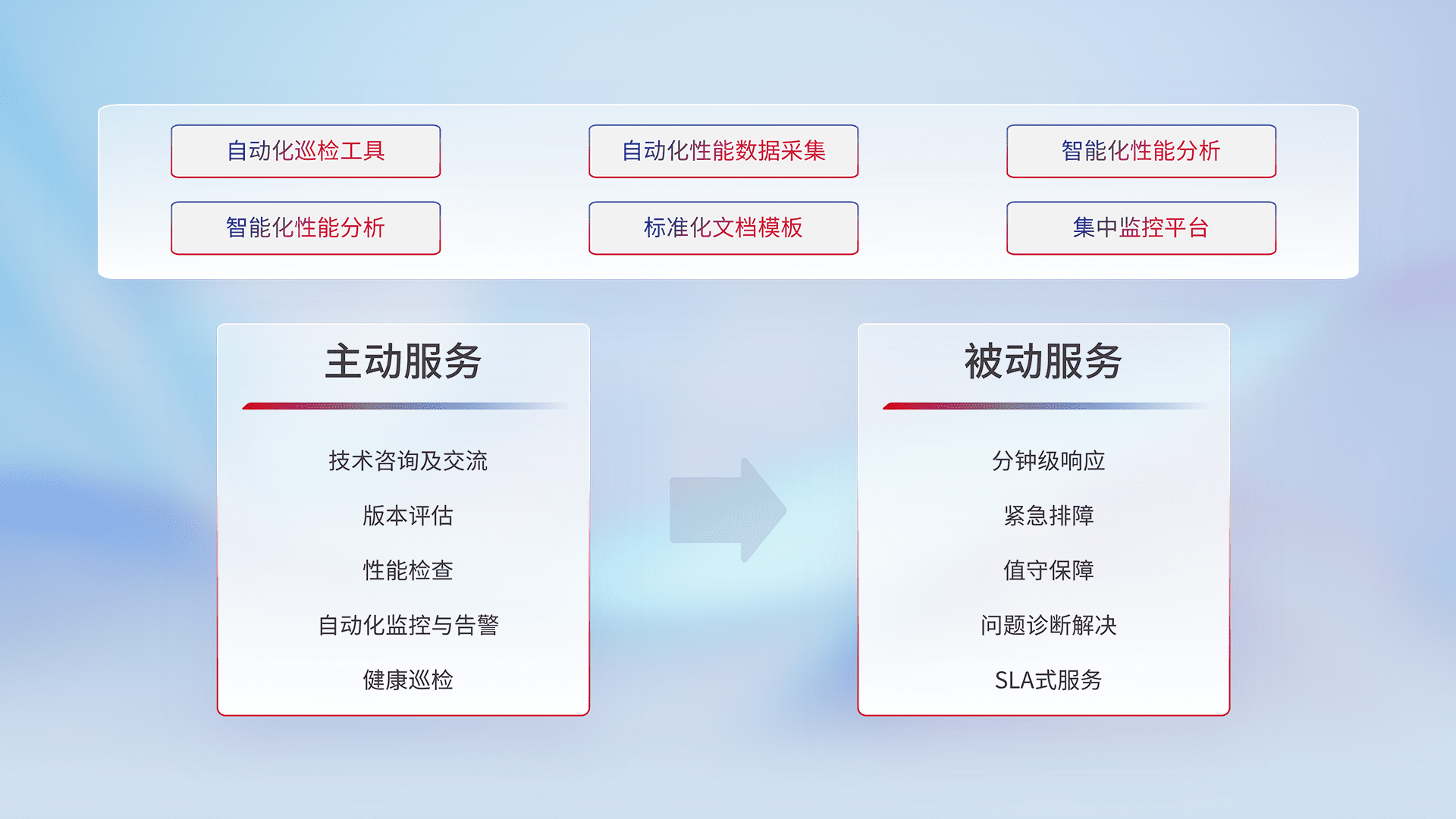 智能化工具和标准化文档,,,,保障服务质量,,提供主动服务(包含技术咨询、、版本评估、、性能检查、、、、自动化监控与告警、、、健康巡检)和被动服务包含(分钟级响应、、紧急排障、、、值守保障、、问题诊断解决、、、、SLA服务)。。。。